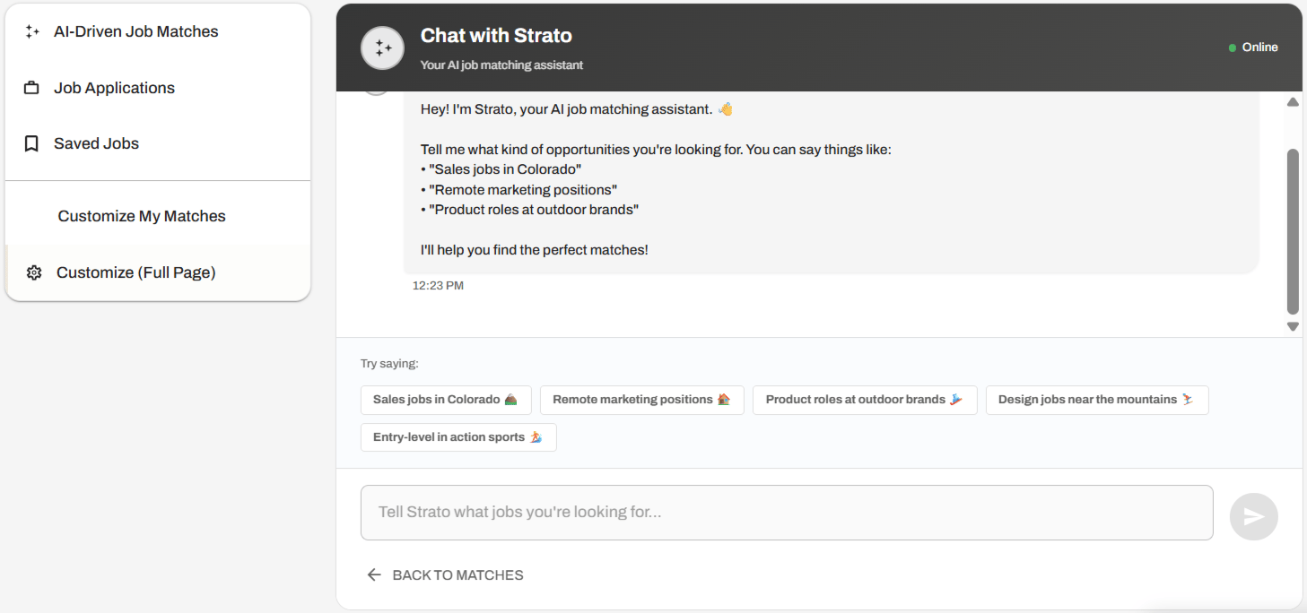 We’re working around the clock to crack the code to bring you all of the greatest jobs from the greatest brands, and getting closer every day to making it real. We recently launched Strato, pictured here. You can login, have a quick chat to set a highly customized alert for the jobs you want, and Strato will be on it for you around the clock. No need to worry about keeping an eye on it yourself.