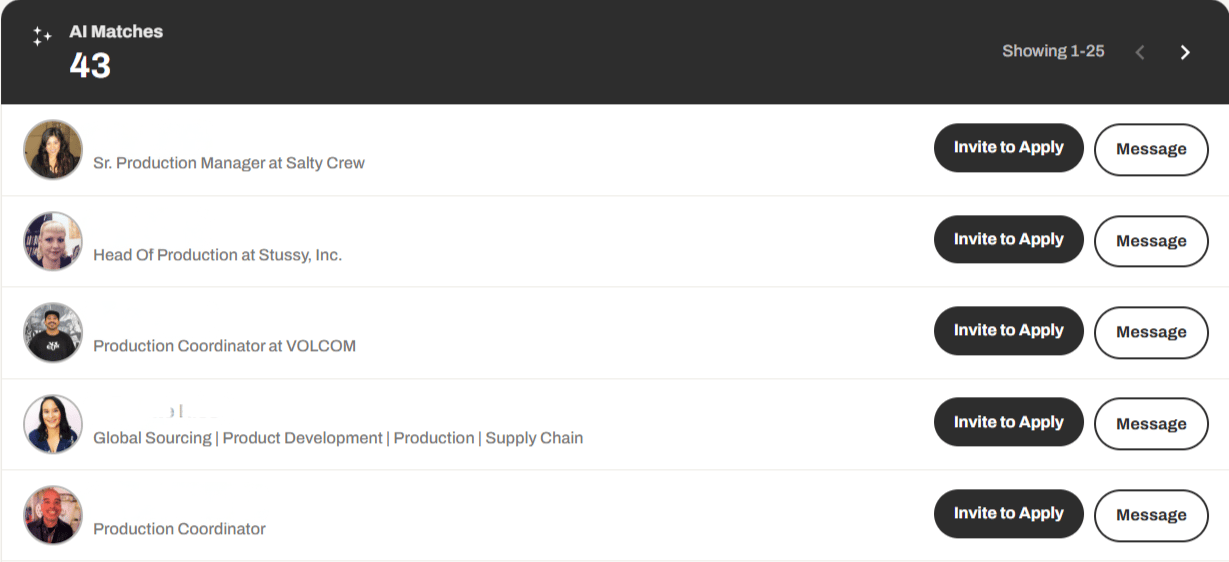 On the hiring side, for the brands that advertise on Malakye, Strato curates a list of people, you for example, that could be a good fit for a job based on the job description and peoples’ profiles. It creates a tidy, clean list and gives the brand rep a button to “Invite” you to apply.
