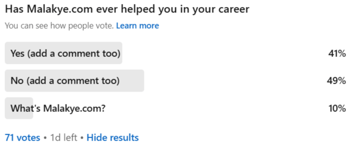This week, we’re getting a pulse check from you. I put a poll out on LinkedIn asking: “Has Malakye.com ever helped your career?” The comments are rolling in, and we want your input too—chime in here.